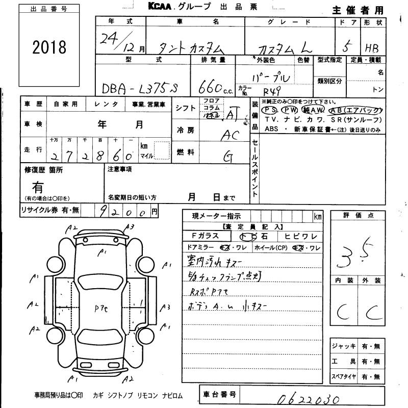 Daihatsu Tanto, 2012 года - Лот№2018 ★3.5