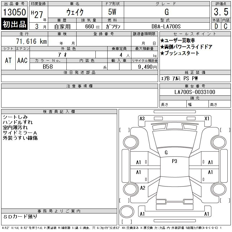 Daihatsu Wake, 2015 года - Лот№13050 ★3.5