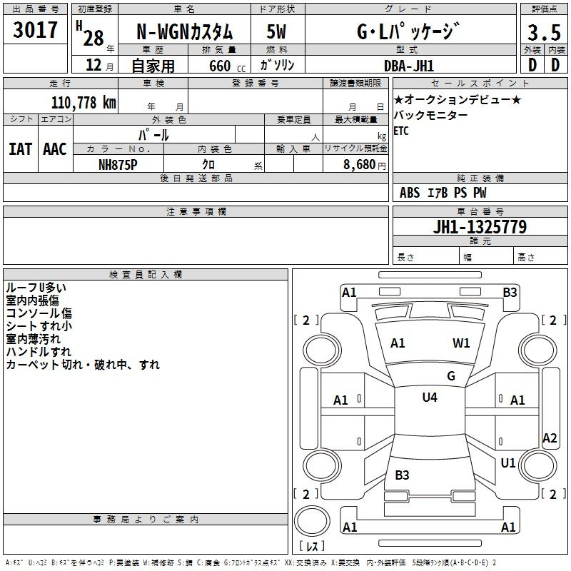 Honda N wgn, 2016 года - Лот№3017 ★3.5