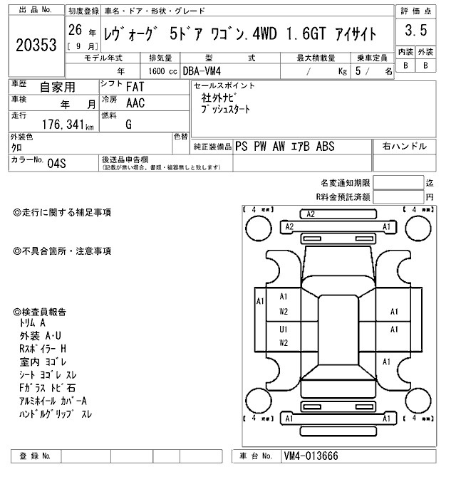 Subaru Levorg, 2014 года - Лот№20353 ★3.5