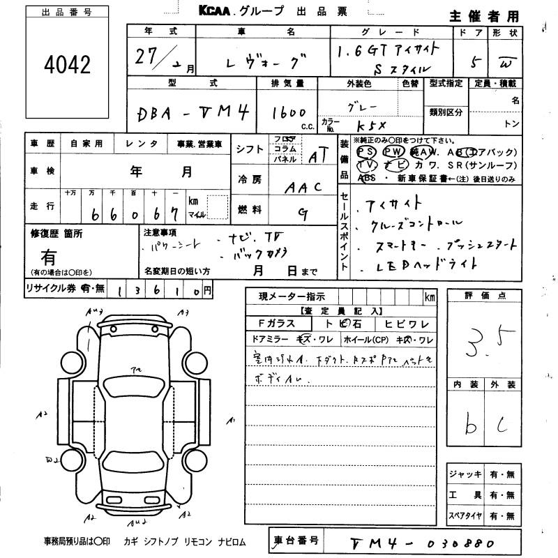 Subaru Levorg, 2015 года - Лот№4042 ★3.5