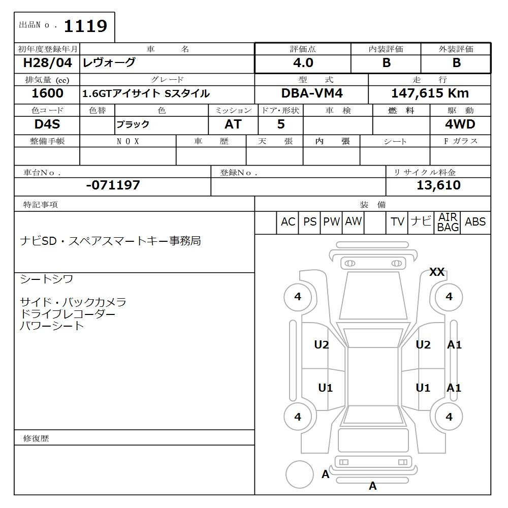 Subaru Levorg, 2016 года - Лот№1119 ★4