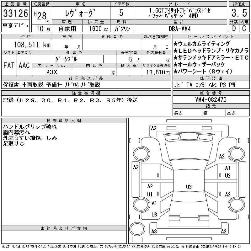Subaru Levorg, 2016 года - Лот№33126 ★3.5