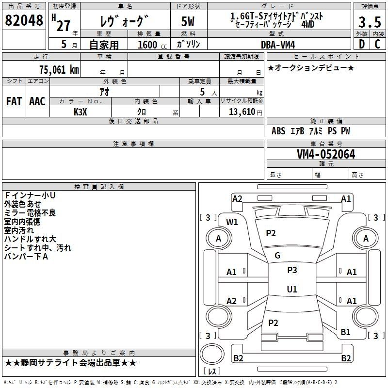 Subaru Levorg, 2015 года - Лот№82048 ★3.5