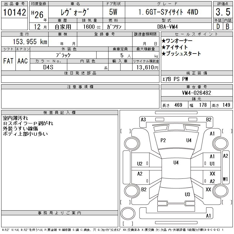 Subaru Levorg, 2014 года - Лот№10142 ★3.5