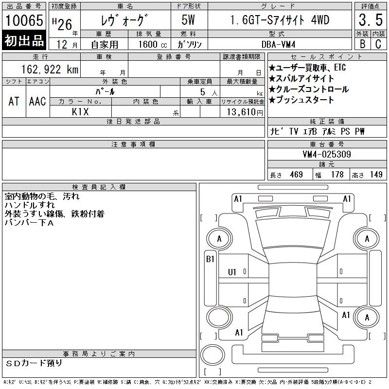 Subaru Levorg, 2014 года - Лот№10065 ★3.5