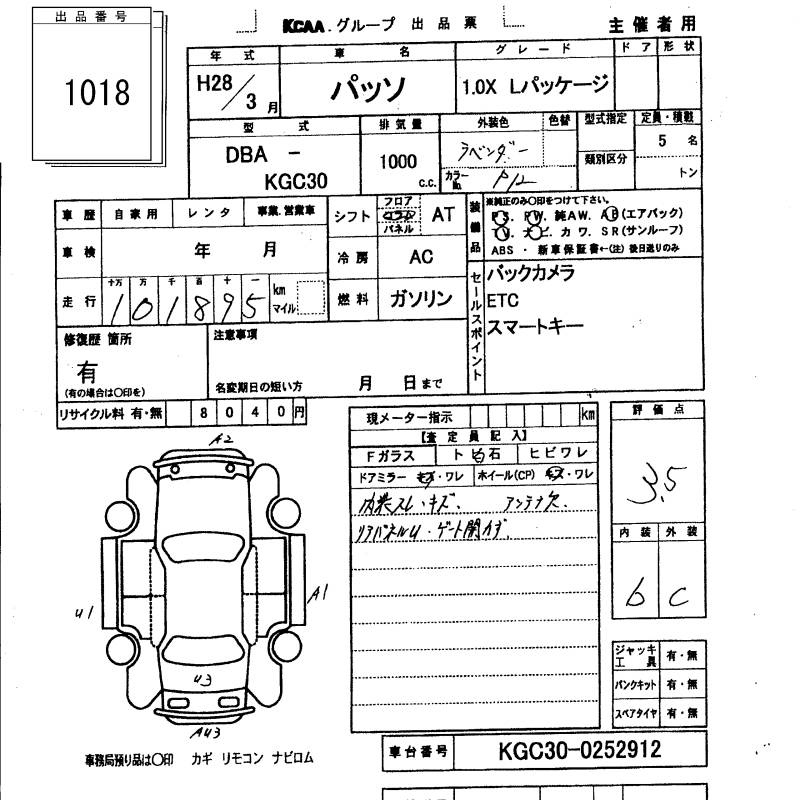 Toyota Passo, 2016 года - Лот№1018 ★3.5