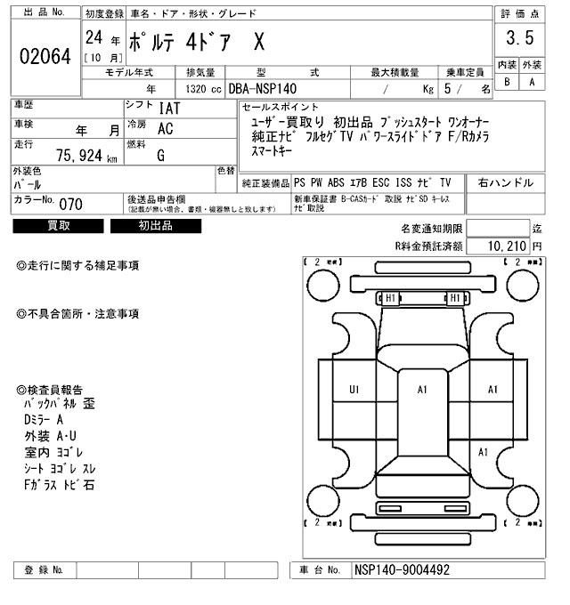 Toyota Porte, 2012 года - Лот№2064 ★3.5