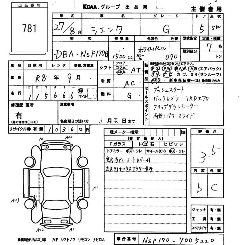 Toyota Sienta, 2015 года - Лот№781 ★3.5