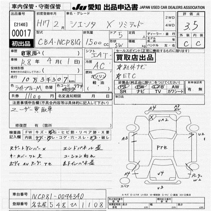 Toyota Sienta, 2005 года - Лот№17 ★3.5
