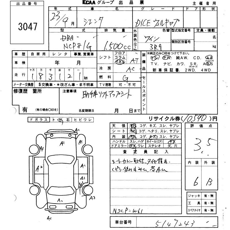 Toyota Sienta, 2011 года - Лот№3047 ★3.5