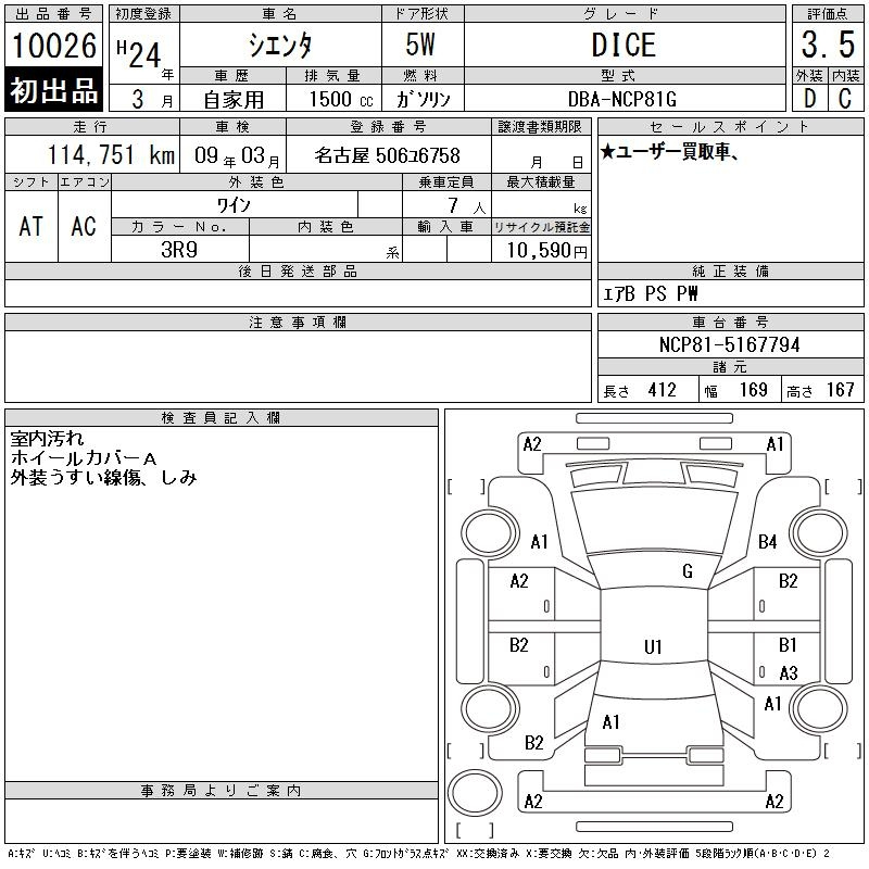 Toyota Sienta, 2012 года - Лот№10026 ★3.5
