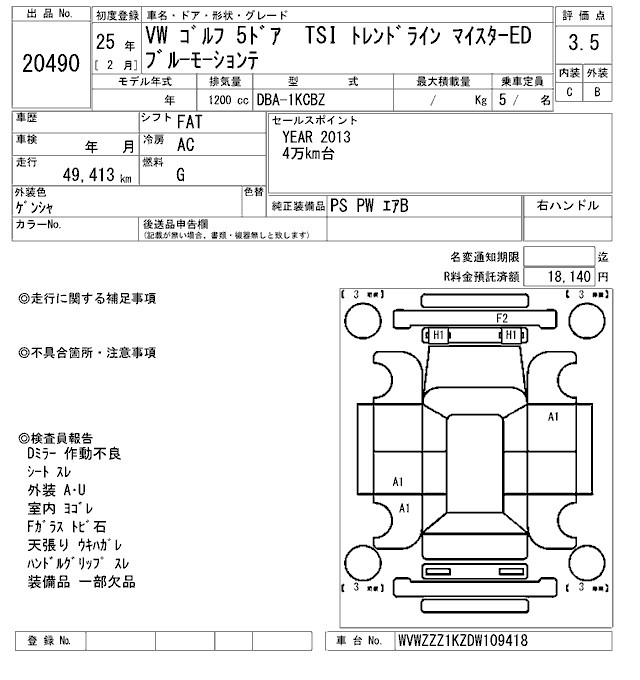 Volkswagen Golf, 2013 года - Лот№20490 ★3.5